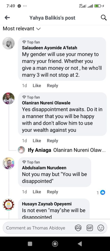 “Do not support a man financially because you want to prevent him from marrying another wife in future, you may be disappointed,” she wrote in a Facebook post on Friday.