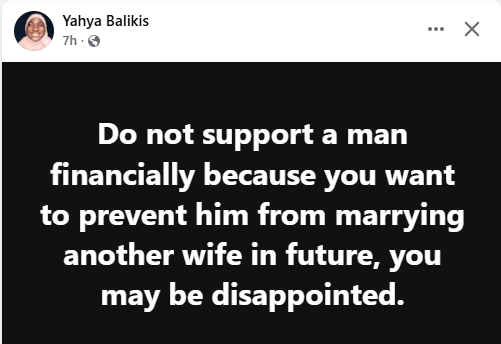 A Nigerian woman, Yahya Balikis, has advised women not to support a man financially with hope that the gesture will make him not to marry another wife in future.