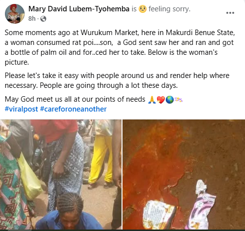 “Some moments ago at Wurukum Market, here in Makurdi Benue State, a woman consumed rat poi….son, a God sent saw her and ran and got a bottle of palm oil and forced her to take. Below is the woman’s picture. Please let’s take it easy with people around us and render help where necessary. People are going through a lot these days. May God meet us all at our points of needs,” she wrote.