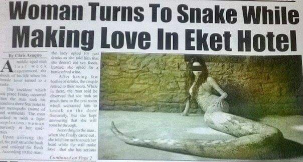 The story of how a woman turned into a snake while having sex with a man inside a hotel room in Eket, Akwa Ibom State, may sound strange and rather out of this world, but a journalist based in the state, Chris Udoh, swore that it happened in real life and he was a witness to it.