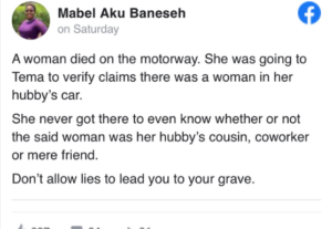 “A woman died on the motorway. She was going to Tema to verify claims there was a woman in her husband’s car. She never got there to even know whether or not the said woman was her hubby’s cousin, co-worker or mere friend. Don’t allow lies to lead you to your grave.”