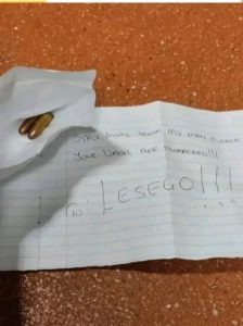 Offentse said in February, someone dropped a letter at night with a strong message and two bullets attacked to it.