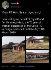 “I am writing on behalf of myself and family in regards to the 70 year old woman suspected of the Covid -19 in Enugu published on Saturday 14th March 2020.