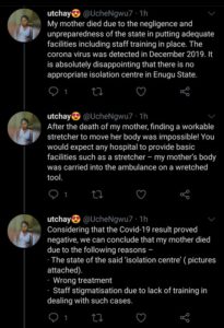 “In conclusion, l would like to reiterate that the environment of the isolation centre, staff behaviour and the unpreparedness of the Enugu state government resulted to my mother’s unexpected death”.