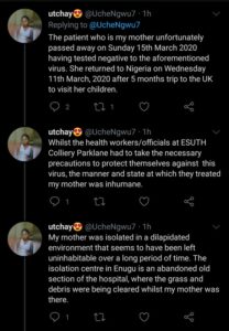 “In conclusion, l would like to reiterate that the environment of the isolation centre, staff behaviour and the unpreparedness of the Enugu state government resulted to my mother’s unexpected death”.