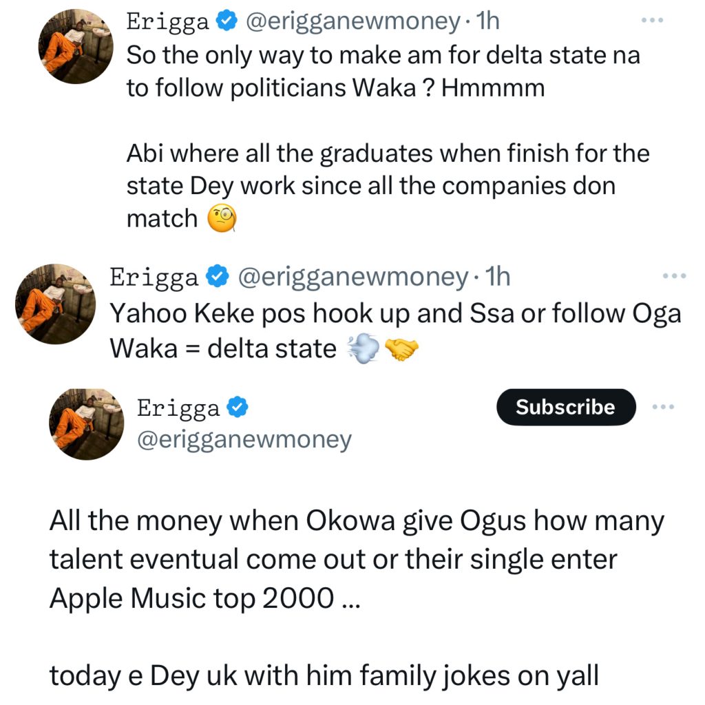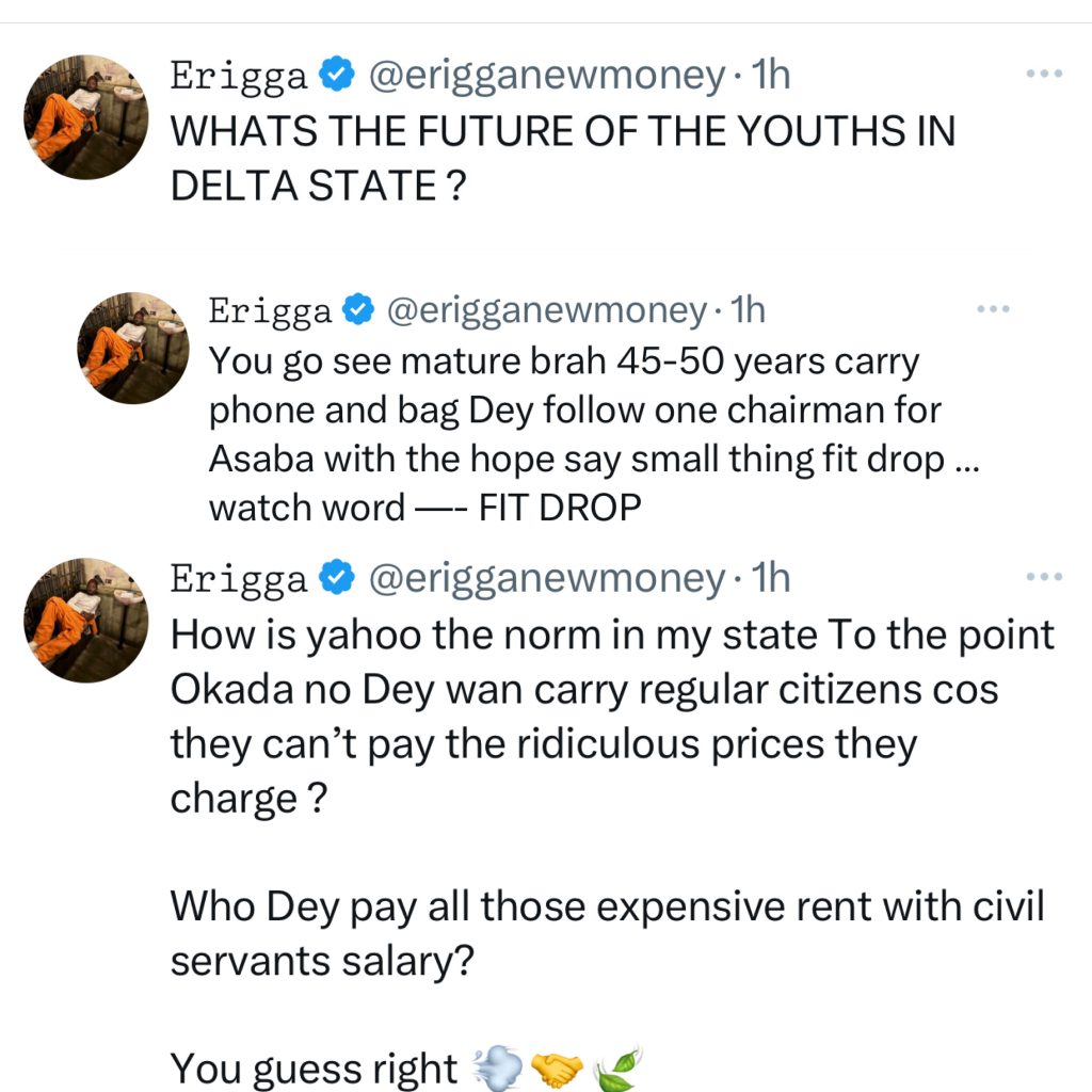 In a series of posts shared on his X handle this morning, Erigga stated that the prevailing jobs for youths in the state is now POS operators, Yahoo, Keke Napep drivers, Hook up or become an SSA or an aide to a ‘big man’.