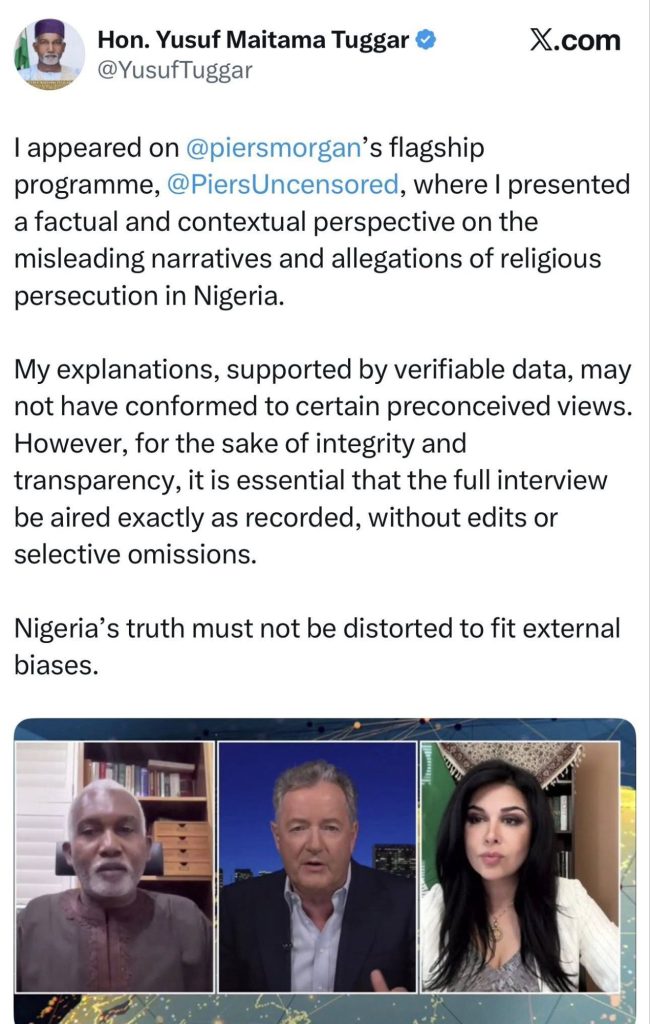 Political analyst Goldie Ghamari has sharply criticised Nigeria’s Minister of Foreign Affairs, Yusuf Tuggar, after he publicly demanded that his full interview on Piers Morgan’s show be aired without any edits.