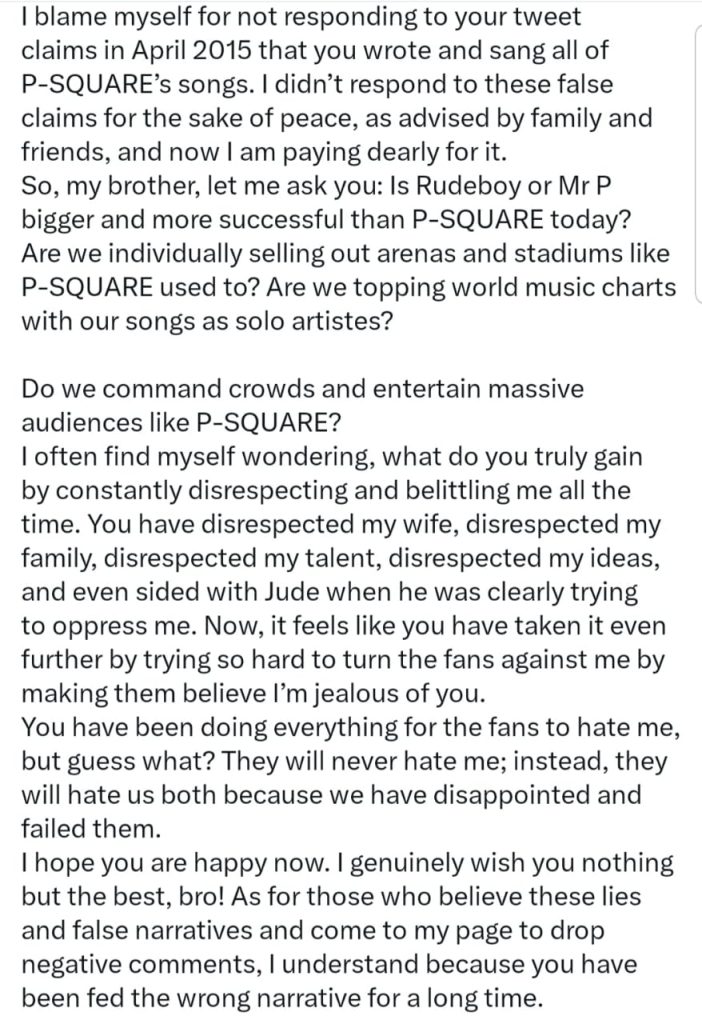 Popular Nigerian singer Peter Okoye, a.k.a. Mr. P of PSquare, has penned an open letter to his twin brother and former music partner, Paul Okoye, a.k.a. Rudeboy of PSquare.