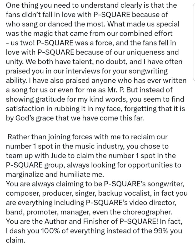 “Rather than joining forces with me to reclaim our number 1 spot in the music industry, you chose to team up with Jude to claim the number 1 spot in the P-SQUARE group, always looking for opportunities to marginalize and humiliate me,” Peter Okoye is quoted as saying in the letter.
