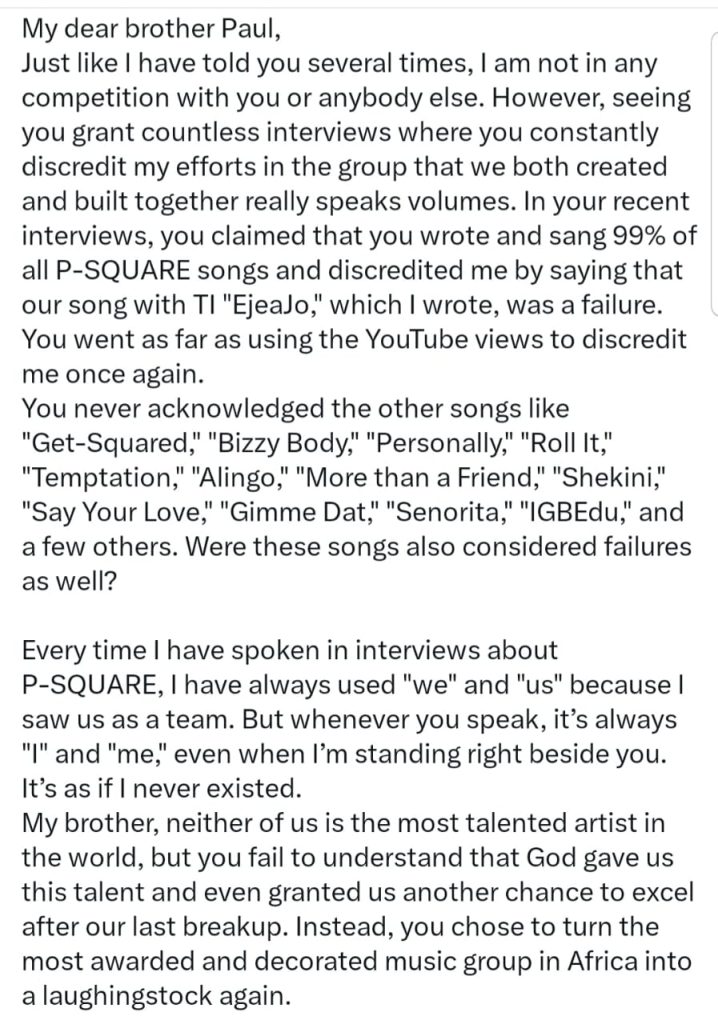 In the letter, Peter Okoye accuses his twin brother of looking for opportunities to marginalize and humiliate him.