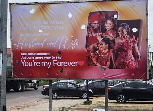 In a romantic gesture that has captured hearts online, a large billboard featuring a photo of Ugonna alongside the bold inscription “You are mine forever” was unveiled shortly after the couple tied the knot in July 2025.
