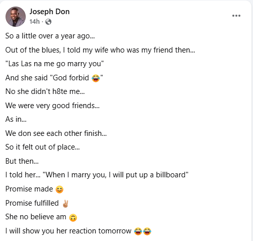 “But then… I told her… ‘When I marry you, I will put up a billboard.’ Promise made. Promise fulfilled. She no believe am. I will show you her reaction tomorrow,” Joseph wrote in a heartfelt post.
