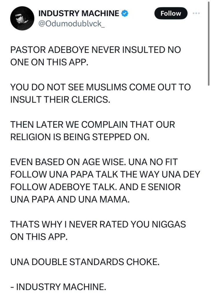In a post shared in X, Odumodu argued that Muslims do not come online to insult their clerics and averred that this is why Christianity is sometimes being ‘’stepped on”.