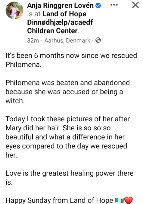 Danish aid worker, Anja Ringgren Loven, has shared photos of a young girl, Philomena, six months since she was rescued in Akwa Ibom State after being accused of being a witch.