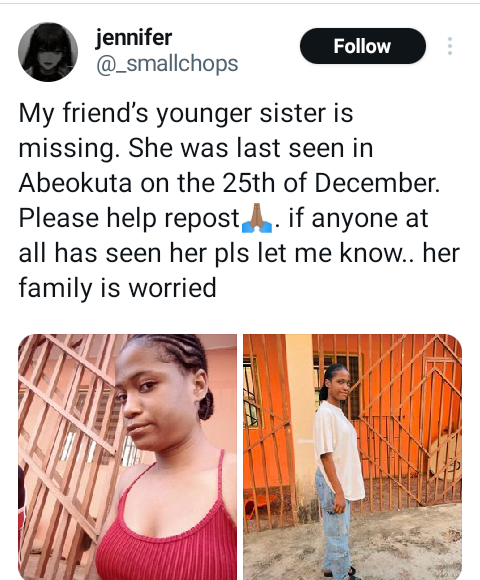 According to one Jennifer, the girl was last seen in Abeokuta on Christmas Day, December 25, 2023.