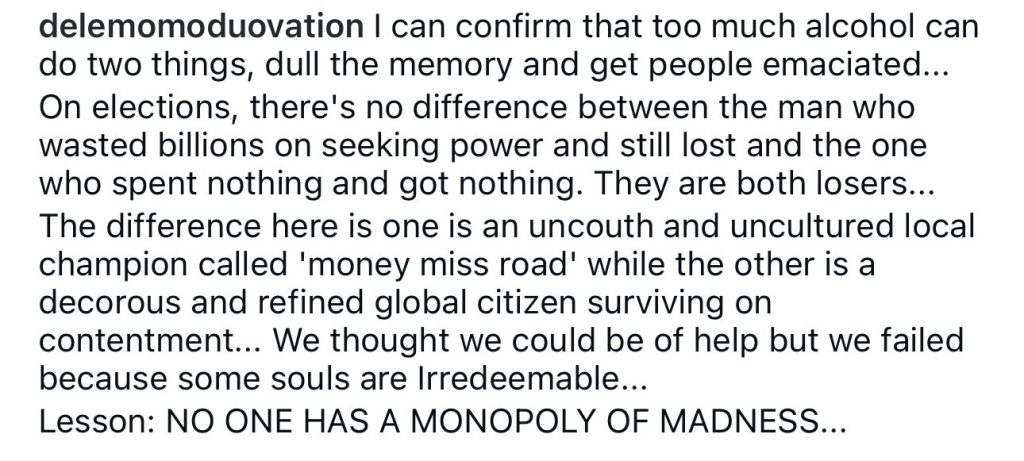 In a final remark that underscores the tension between both public figures, Momodu concluded, “Lesson: NO ONE HAS A MONOPOLY OF MADNESS.”